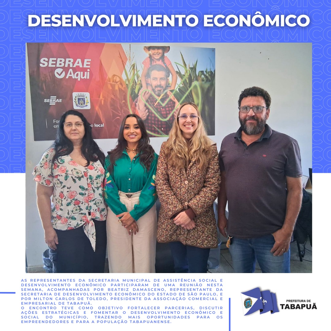 Nesta semana, representantes da Secretaria Municipal de Assistência Social e Desenvolvimento Econômico participaram de uma importante reunião ao lado de Beatriz Damasceno, da Secretaria de Desenvolvimento Econômico do Estado de São Paulo, e de Milton Carlos de Toledo, presidente da Associação Comercial e Empresarial de Tabapuã.