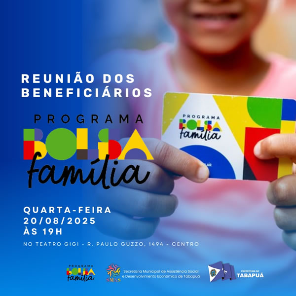 A Secretaria Municipal de Assistência Social e Desenvolvimento Econômico de Tabapuã convida todos os beneficiários para participarem da Reunião do Programa Bolsa Família, que acontecerá: