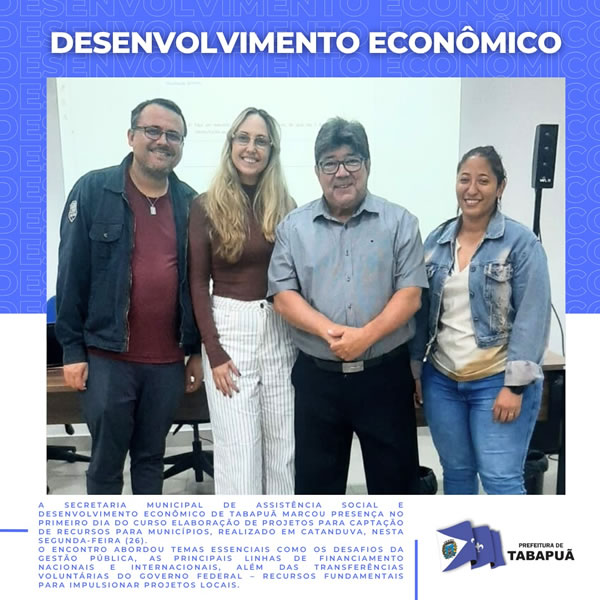 A Secretaria Municipal de Assistência Social e Desenvolvimento Econômico de Tabapuã marcou presença no primeiro dia do curso Elaboração de Projetos para Captação de Recursos para Municípios, realizado em Catanduva, nesta segunda-feira (26).