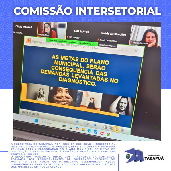 A Prefeitura de Tabapuã, por meio da Comissão Intersetorial instituída pelo Decreto nº 061/2025, realizou ontem a primeira reunião para a elaboração do Plano Municipal de Metas de Prevenção e Enfrentamento à Violência Doméstica e Familiar contra a Mulher.