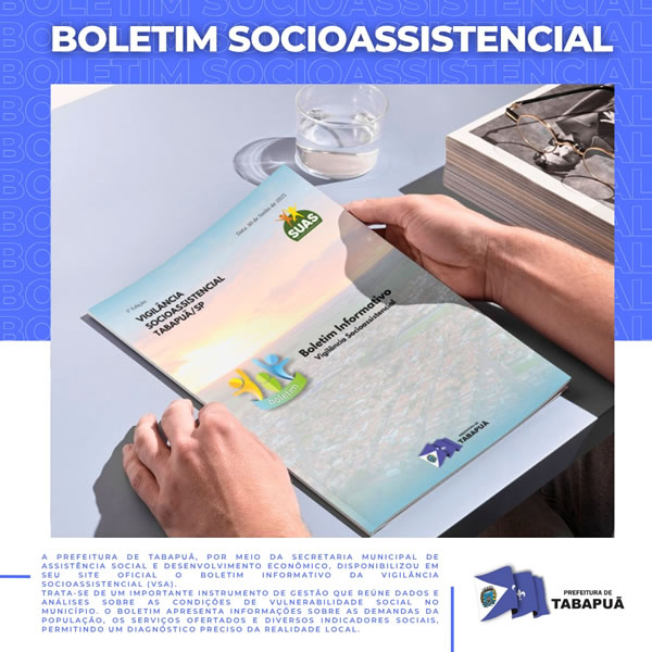 A Prefeitura de Tabapuã, por meio da Secretaria Municipal de Assistência Social e Desenvolvimento Econômico, disponibilizou em seu site oficial o Boletim Informativo da Vigilância Socioassistencial (VSA).