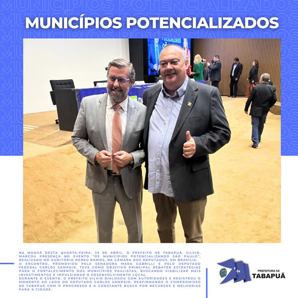 Na manhã desta quarta-feira, 23 de abril, o prefeito de Tabapuã marcou presença no evento “Os Municípios Potencializando São Paulo”. O evento foi realizado no Auditório Nereu Ramos, na Câmara dos Deputados, em Brasília.