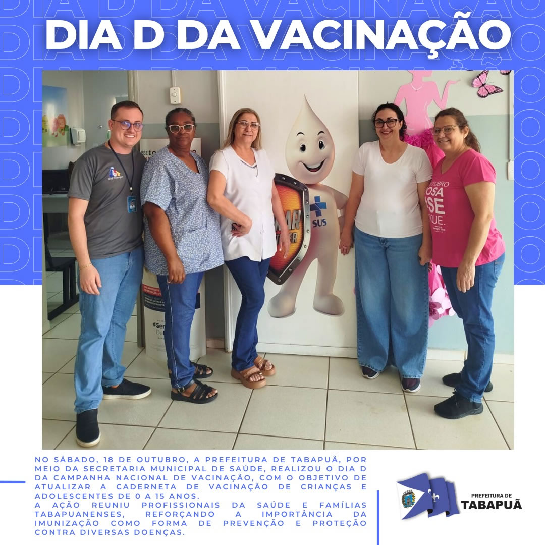No sábado, 18 de outubro, a Prefeitura de Tabapuã, por meio da Secretaria Municipal de Saúde, realizou o Dia D da Campanha Nacional de Vacinação, com o objetivo de atualizar a caderneta de vacinação de crianças e adolescentes de 0 a 15 anos.