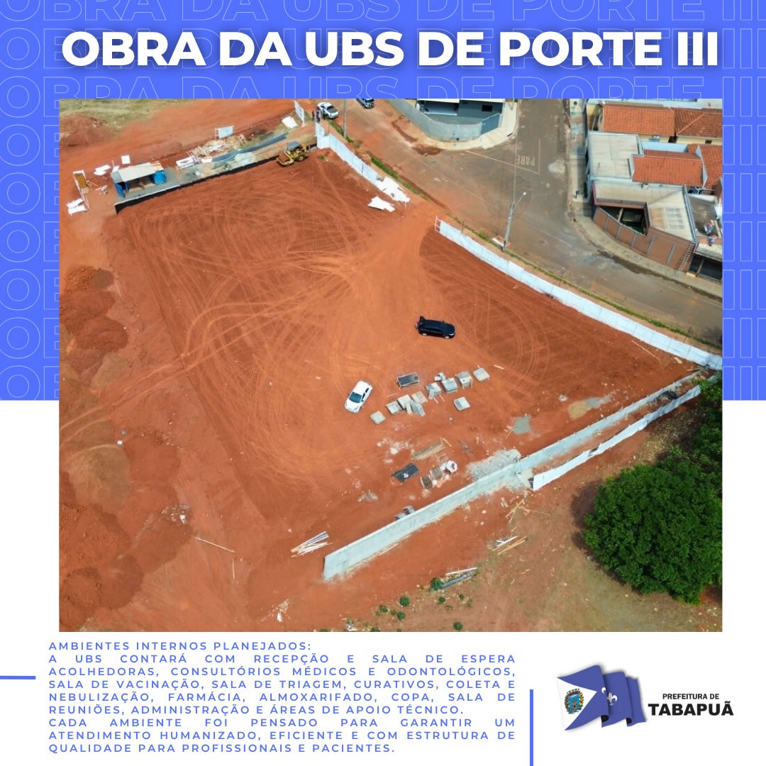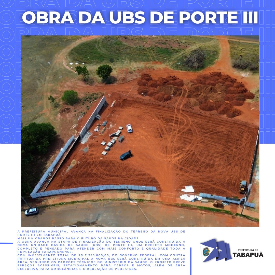A obra avança na etapa de finalização do terreno onde será construída a nova Unidade Básica de Saúde (UBS) de Porte III, um projeto moderno, completo e pensado para atender com mais conforto e qualidade toda a população tabapuanense.