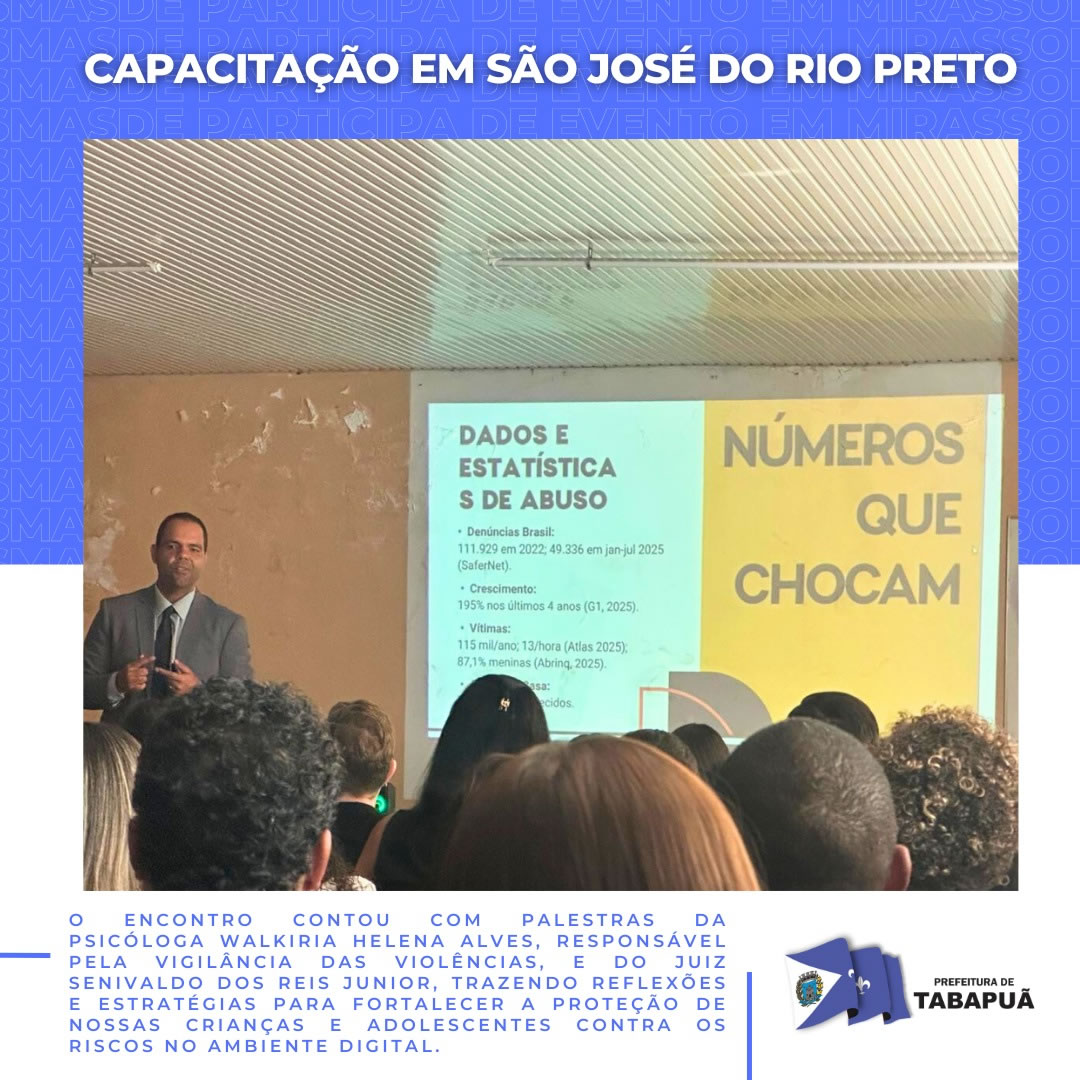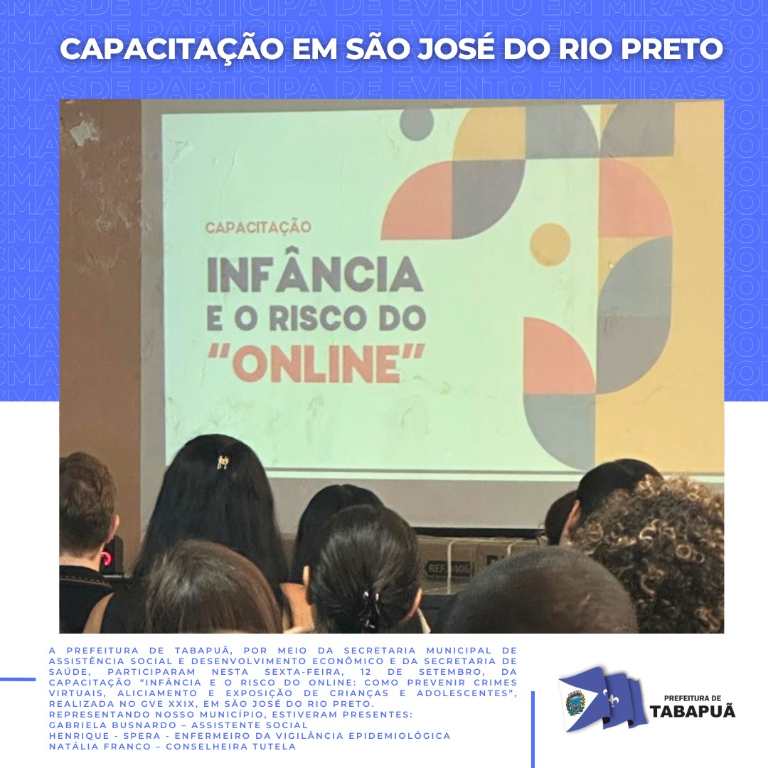 A Prefeitura de Tabapuã, por meio da Secretaria Municipal de Assistência Social e Desenvolvimento Econômico e da Secretaria de Saúde, participaram nesta sexta-feira, 12 de setembro, da capacitação “Infância e o risco do online: como prevenir crimes virtuais, aliciamento e exposição de crianças e adolescentes”, realizada no GVE XXIX, em São José do Rio Preto.