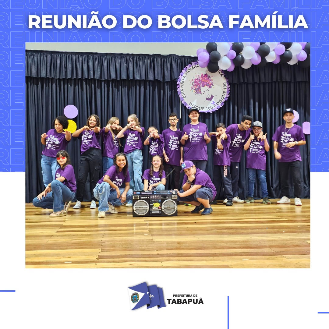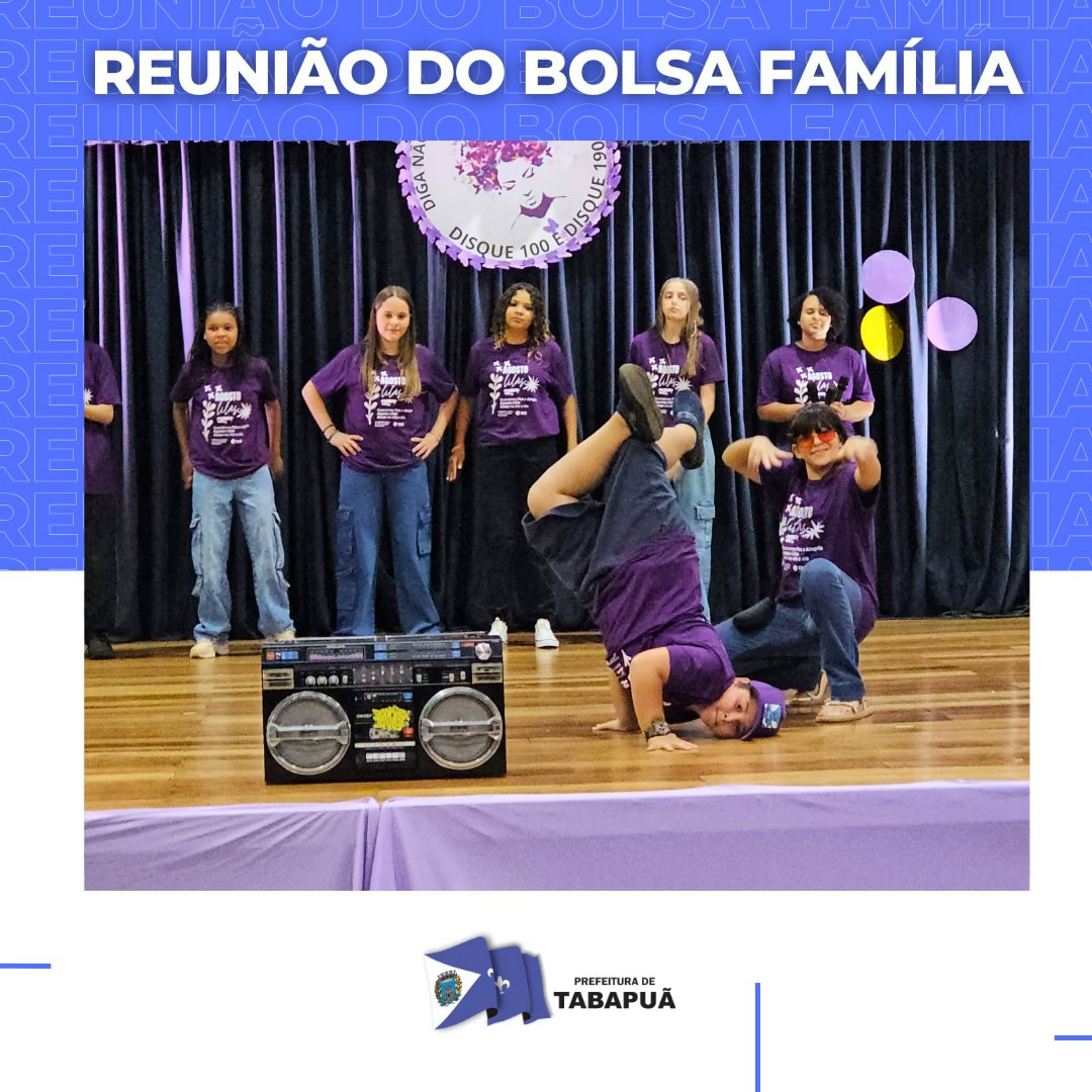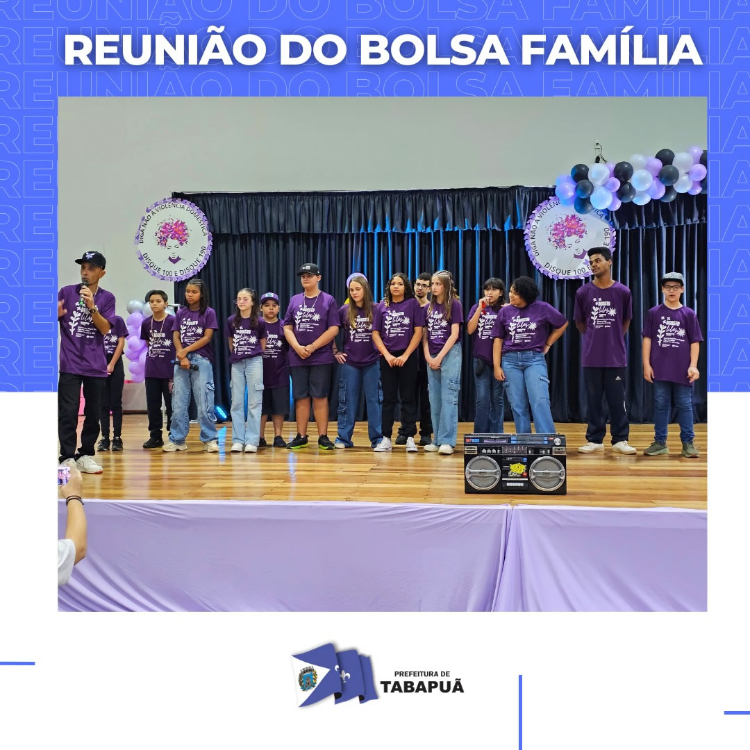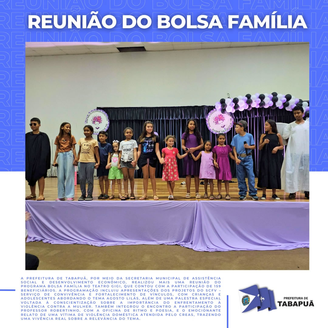 A Prefeitura de Tabapuã, por meio da Secretaria Municipal de Assistência Social e Desenvolvimento Econômico, realizou mais uma reunião do Programa Bolsa Família no Teatro Gigi, que contou com a participação de 159 beneficiários. A programação incluiu apresentações dos projetos do SCFV - Serviço de Convivência e Fortalecimento de Vínculos, com crianças e adolescentes abordando o tema Agosto Lilás, além de uma palestra especial voltada à conscientização sobre a importância do enfrentamento à violência contra a mulher.