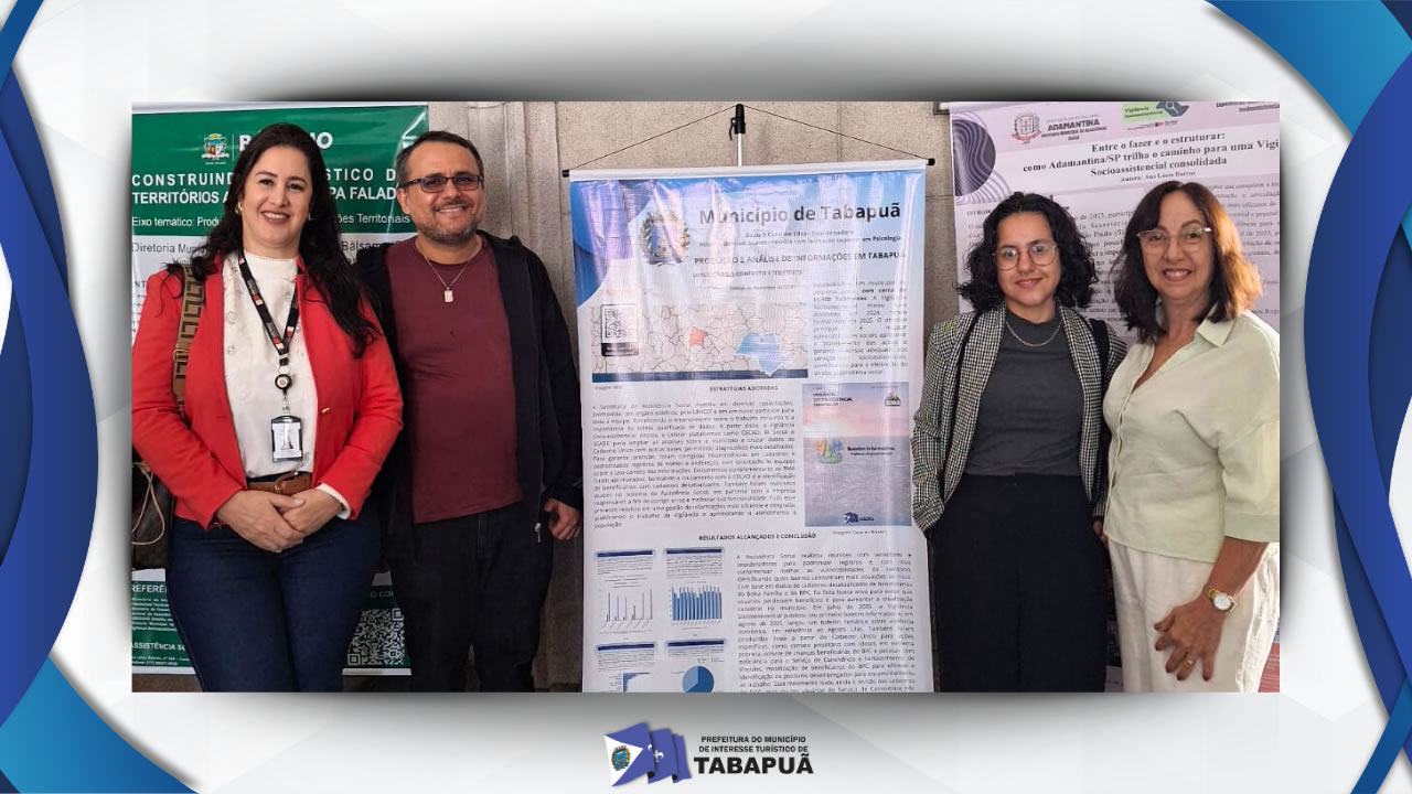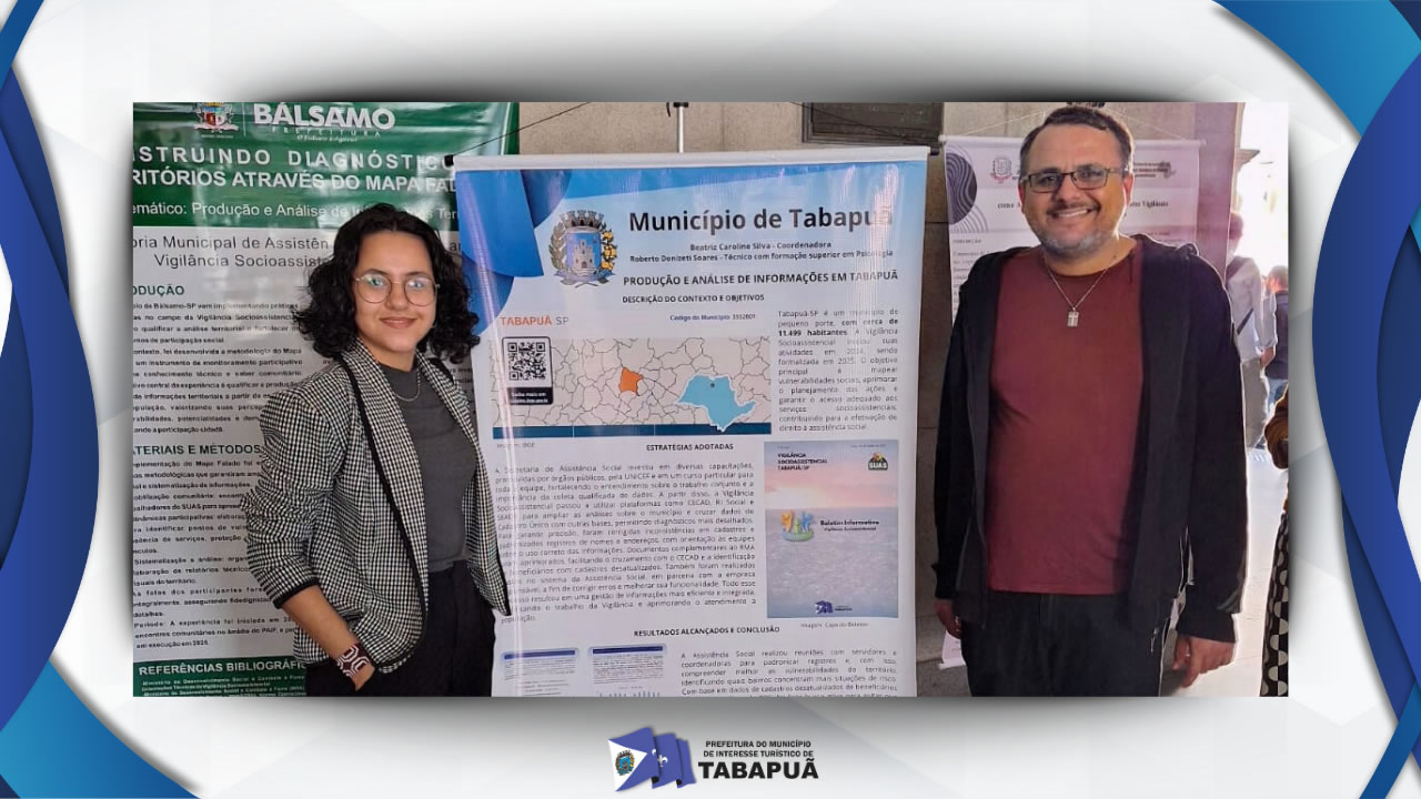 Representando Tabapuã, os servidores Beatriz Caroline Silva e Roberto Donizeti Soares apresentaram em um banner todo o projeto desenvolvido no município com os avanços no levantamento e análise de dados, bem como na publicação dos boletins informativos, que têm contribuído para aprimorar o planejamento e a gestão das políticas públicas de assistência social.