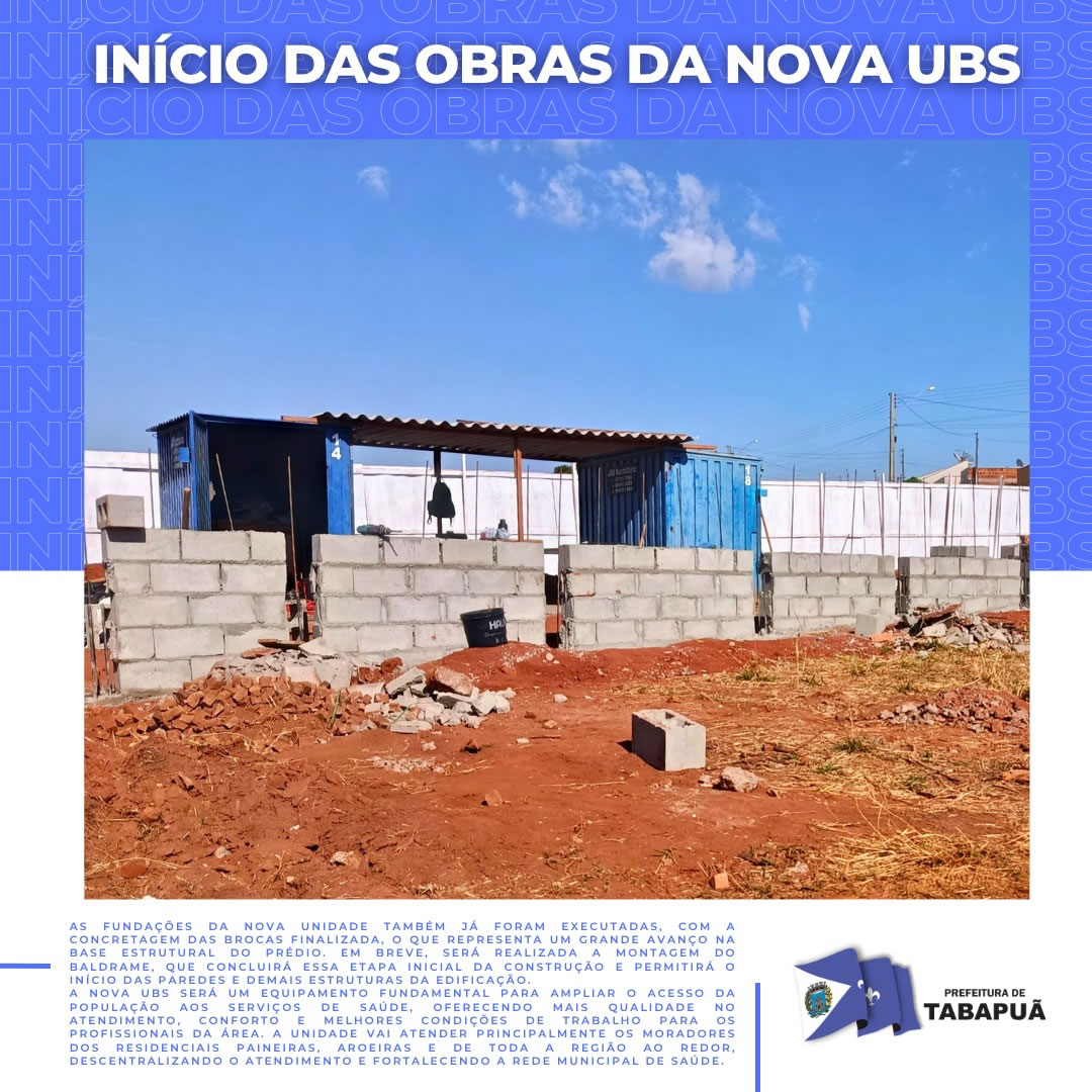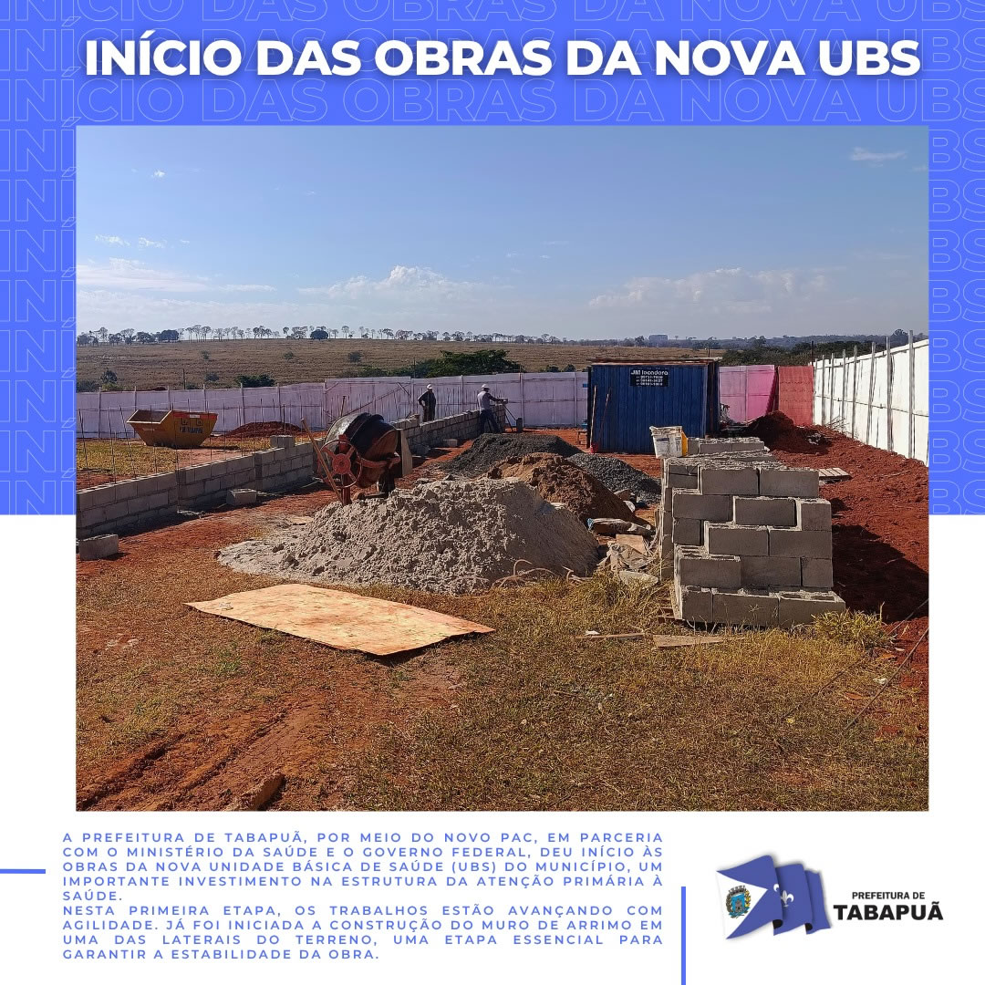 A Prefeitura de Tabapuã, por meio do Novo PAC, em parceria com o Ministério da Saúde e o Governo Federal, deu início às obras da nova Unidade Básica de Saúde (UBS) do município, um importante investimento na estrutura da atenção primária à saúde.