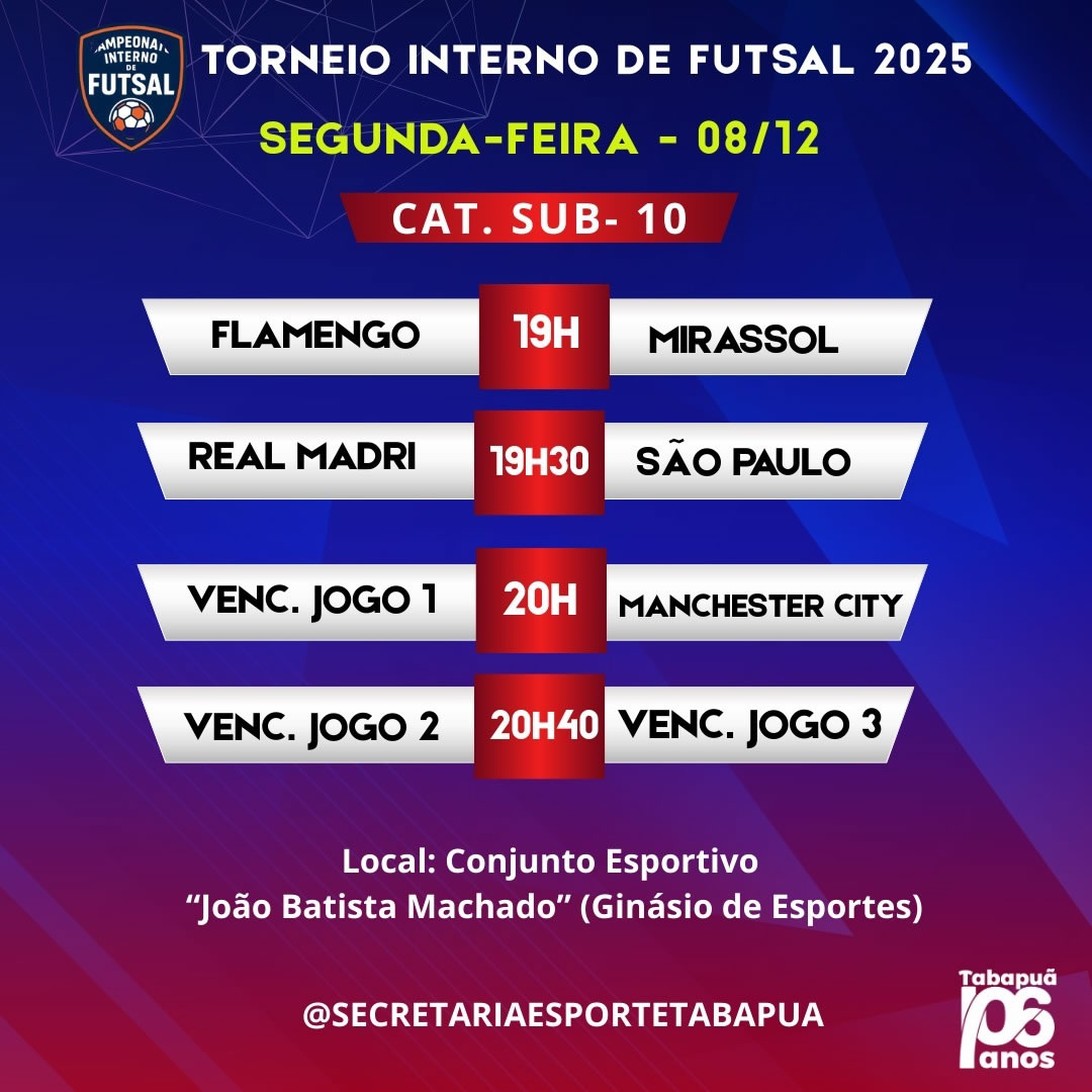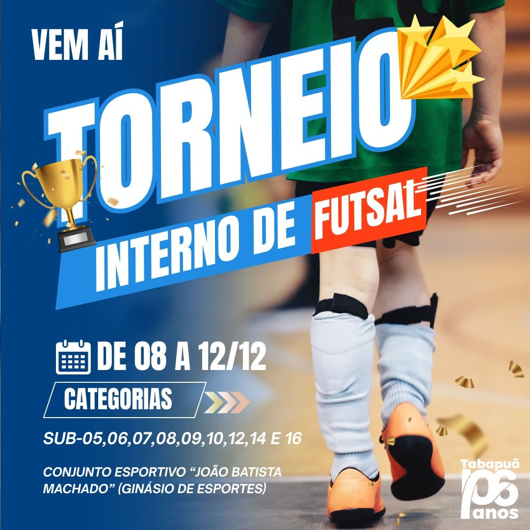 Nesta segunda-feira, 8 de dezembro, a partir das 19h, terá início o Torneio Interno de Futsal, que reunirá mais de 250 crianças ao longo de cinco dias de competição, entre 8 e 12 de dezembro, no Conjunto Esportivo “João Batista Machado” (Ginásio de Esportes).