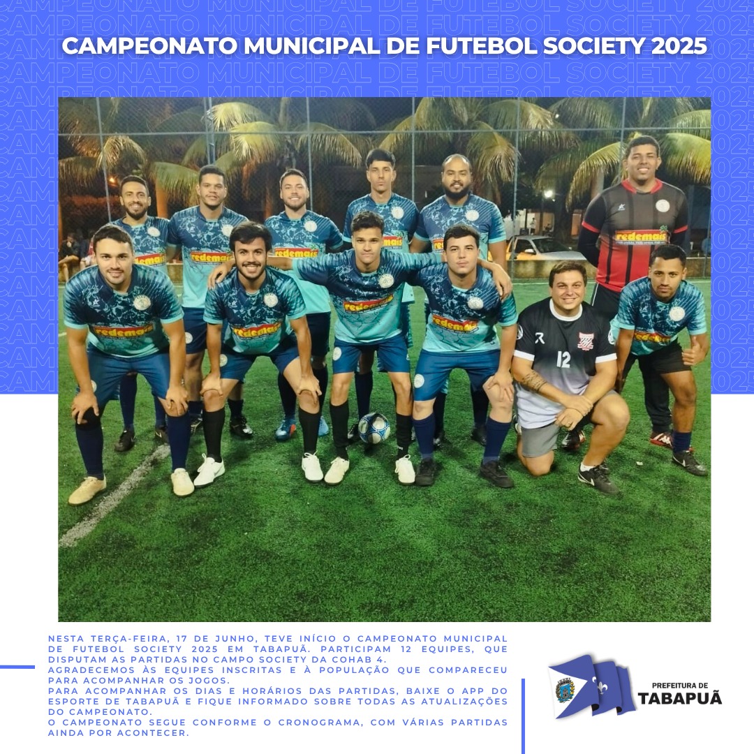 Nesta terça-feira, 17 de junho, teve início o Campeonato Municipal de Futebol Society 2025 em Tabapuã. Participam 12 equipes, que disputam as partidas no campo Society da Cohab 4.