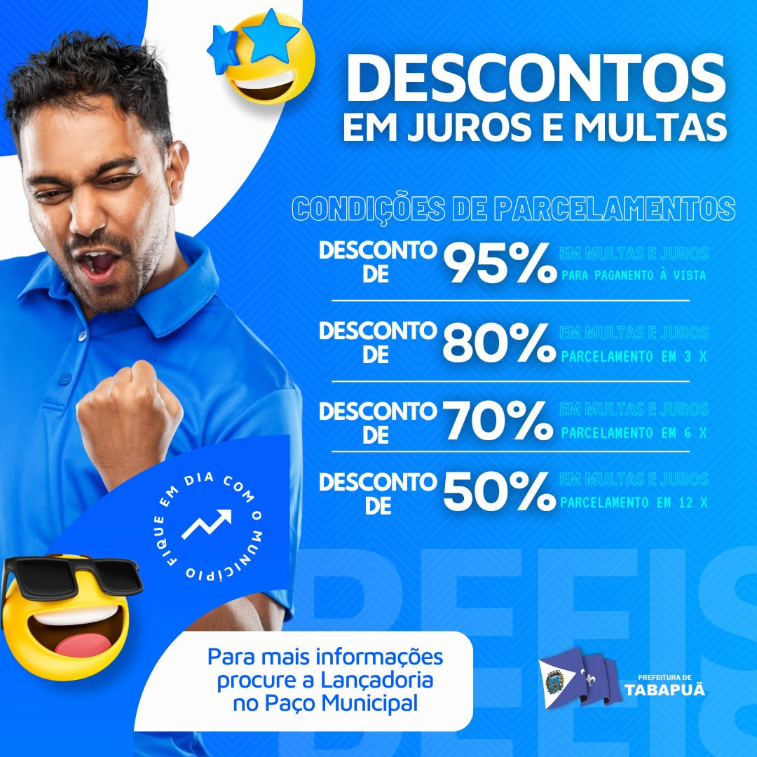 Os contribuintes com dívidas atrasadas com a Prefeitura Municipal de Tabapuã poderão parcelar seu débito em até 12 vezes com descontos no valor dos juros e multas que podem chegar a 95%.